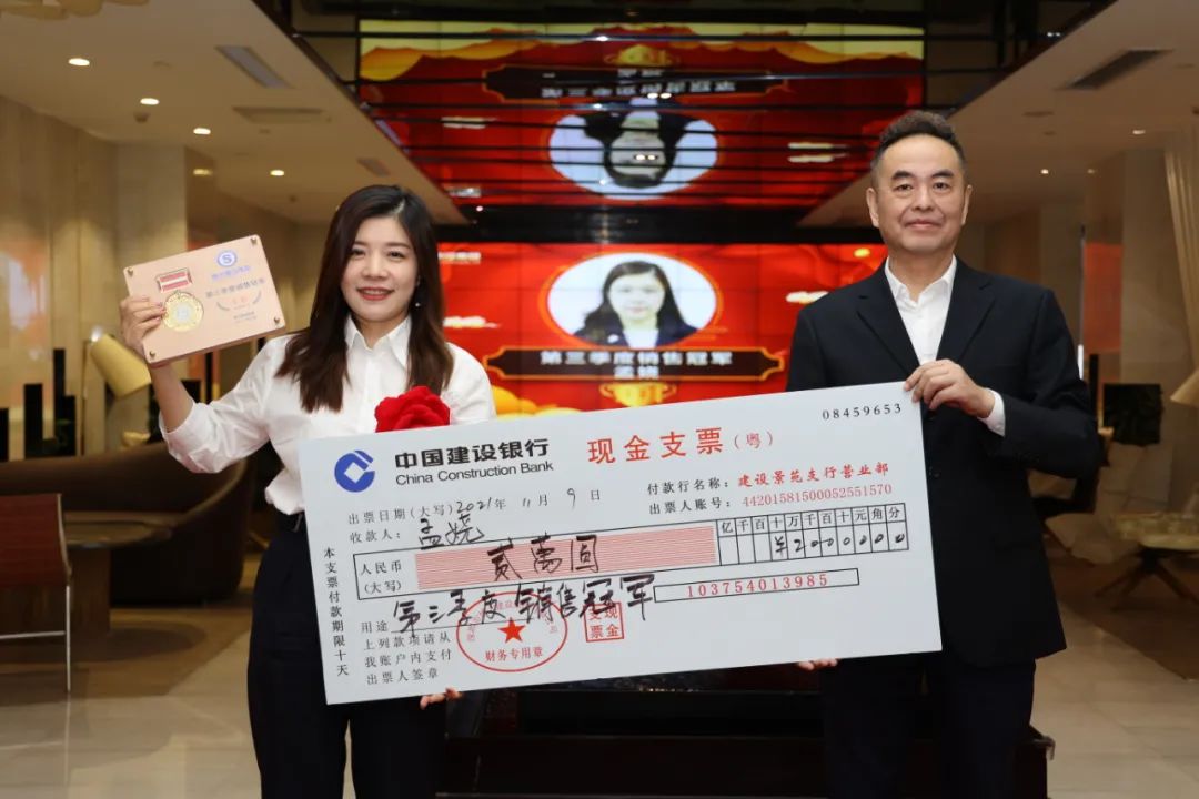 圖 | 董事長(zhǎng)洪宇為孟嬈頒發(fā)第三季度銷售冠軍獎(jiǎng)