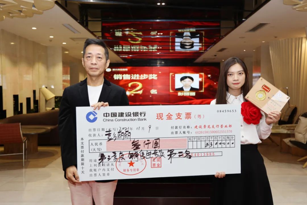 圖 | 集團(tuán)副董事長(zhǎng)李朕鴻為彭麗麗頒發(fā)第三季度銷售進(jìn)步獎(jiǎng)