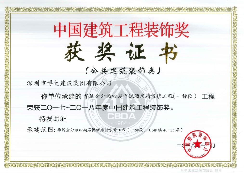 博大建設(shè)集團(tuán)承建的昆明醫(yī)科大學(xué)第一附屬醫(yī)院3號(hào)樓、華遠(yuǎn)金外灘四期君悅酒店、綠景虹灣裙樓商業(yè)公共部分、水貝金座大廈幕墻工程、天健科技大廈幕墻工程等5個(gè)經(jīng)典工程以卓越品質(zhì)榮獲中國(guó)建筑工程裝飾獎(jiǎng)。